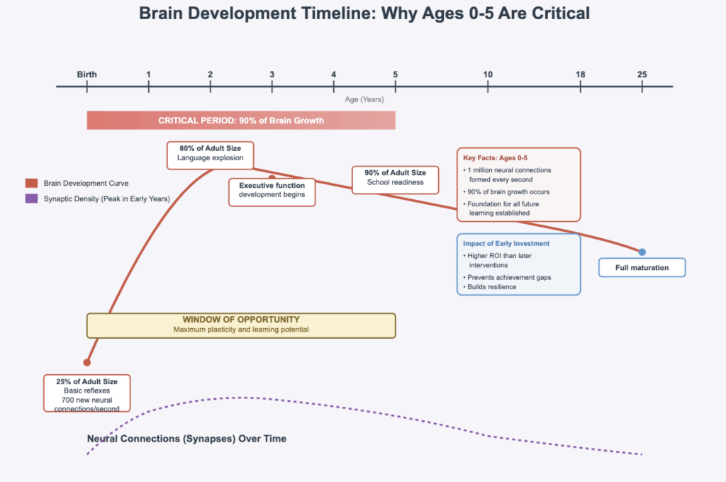 The most critical stage of neurodevelopment occurs between ages 0 and 5, because by age 5, 90% of a child’s brain has developed. A simplified overview of early brain development is illustrated in Figure 1. In the first year of life, around a million synapses are formed every second. After around one year, language skills become important for children to learn. At this time, pruning, the process of strengthening certain synapses, becomes essential. By age five, approximately 90% of the brain’s structural growth occurs, as well as millions of synapses forming each second during infancy1. During this stage, neural circuits in language, cognition, and emotional processing are shaped by environmental input, making early childhood a critical window for development.