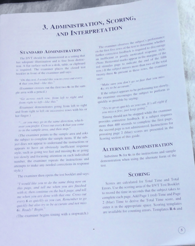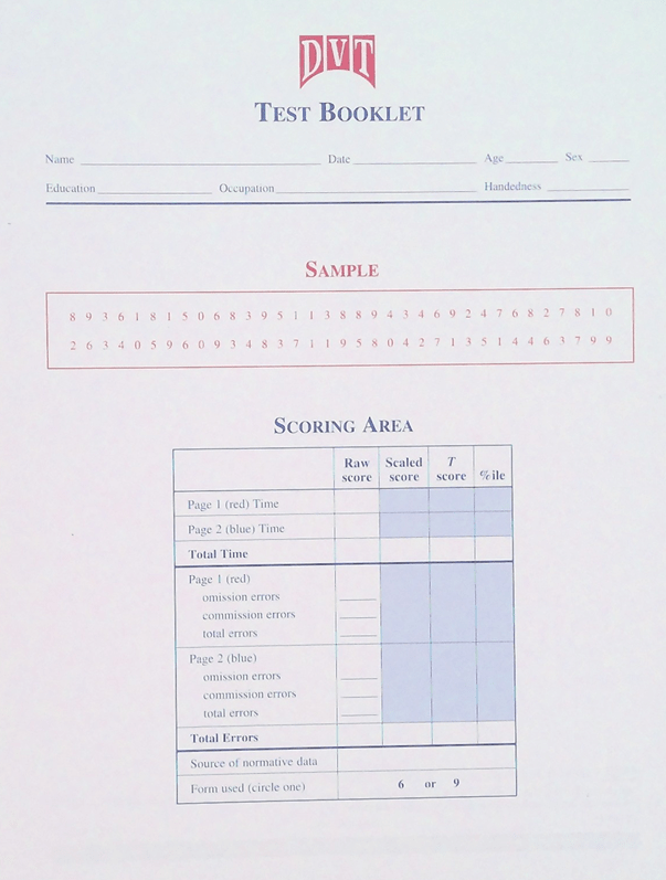 In the DVT a sheet of hundreds of digits 1-9 are scrambled on two sheets of paper. Participants are given specific instructions, found in the user’s guide, to complete the test. They are asked to cross out only the 9s on the sheets. Alternate administration of crossing out 6s is also valid but not used in this study as the administration instructions stated to select only one digit to cross out. See Appendix B for student samples. The DVT is scored with total time (measured in seconds) and errors. If one takes more than 400s to complete page 1 they are asked not to complete page 2. The DVT should take less than 10 minutes. Errors of omission (6s or 9s that are not crossed out) and commission (numbers other than 6 or 9 crossed out) are combined for total errors. The original form of admission (9s) was used for this study. Increased time indicates slow processing speed, but more important to this study, omission indicates a lapse in attention.