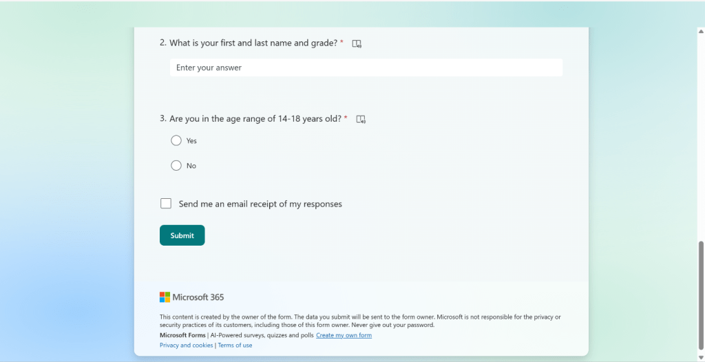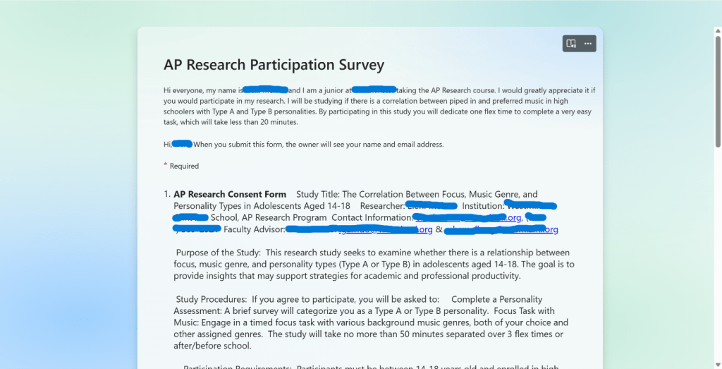 A Microsoft Forms survey, familiar to students due to the school’s requirement for Microsoft Surface Pro devices, was used to collect demographic information, including age and grade level. First and last name were required to keep participants organized and facilitate follow-up communication if they were approved to proceed to the next step, which was taking the personality survey. The survey also obtained informed consent from both participants and their parent/guardian. Potential participants were informed about the goal of this study, what they would be entailed to do, confidentiality of this study, as well as the right to withdraw at any time. Approved participants advanced to the personality assessment phase. See Appendix C for the Microsoft participation form which also includes the consent form. Per confidentiality guidelines all information regarding identifying details, including researcher names, school information, and personal contact information, has been redacted from the consent form.