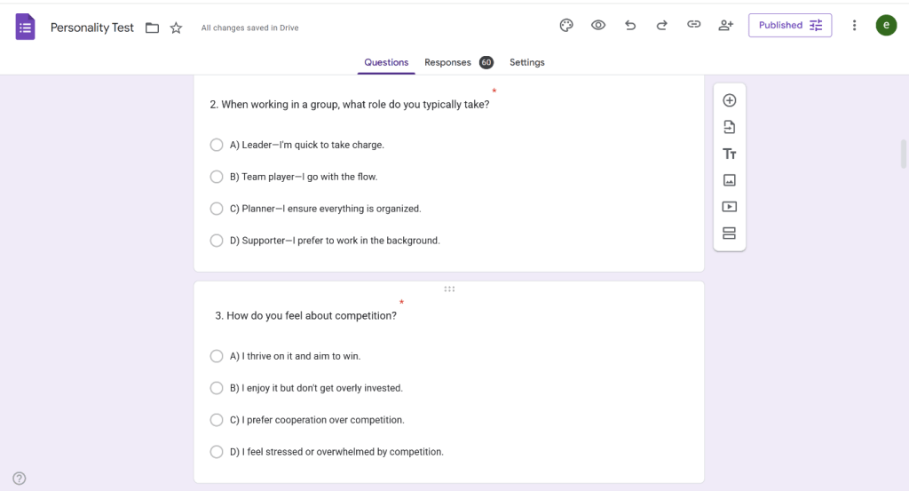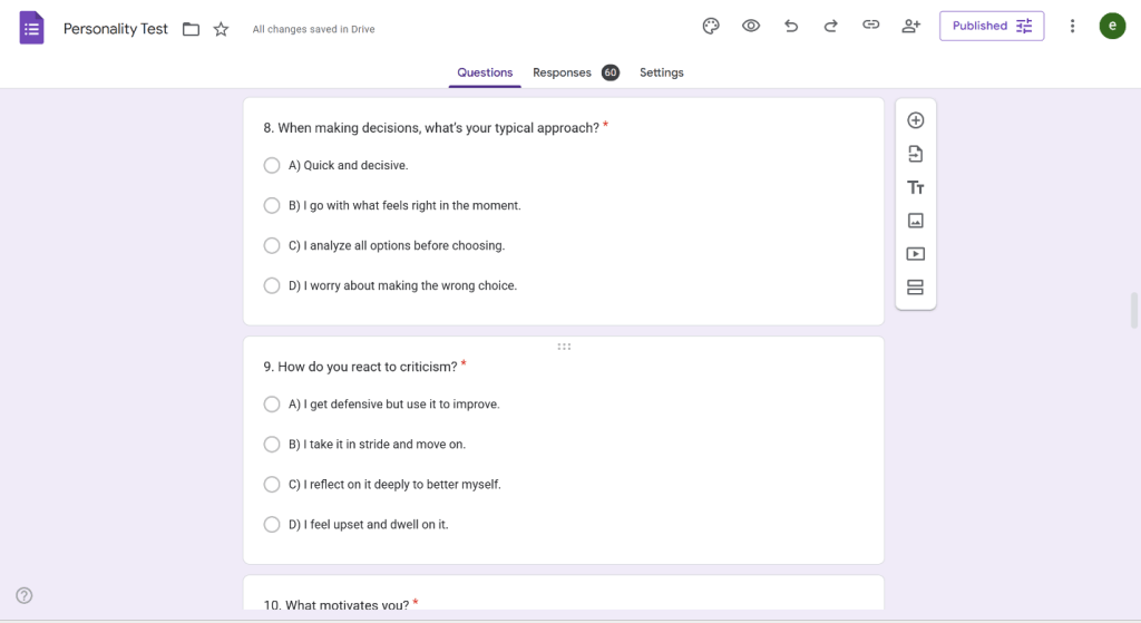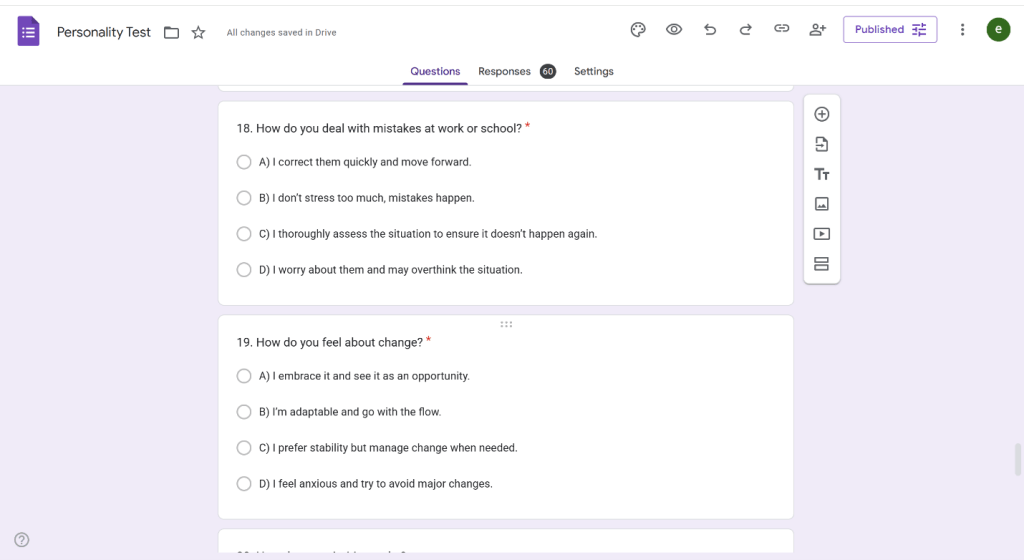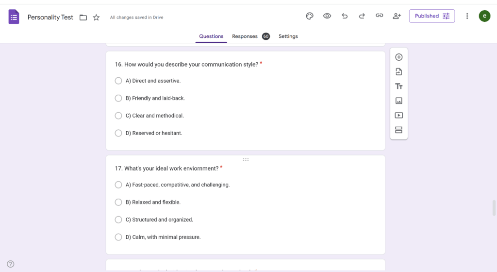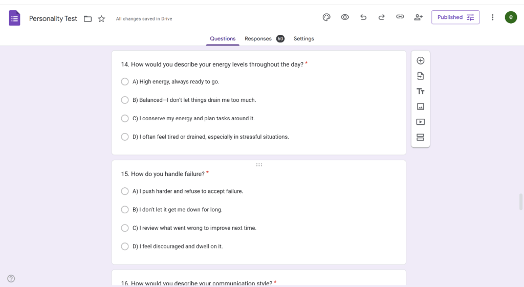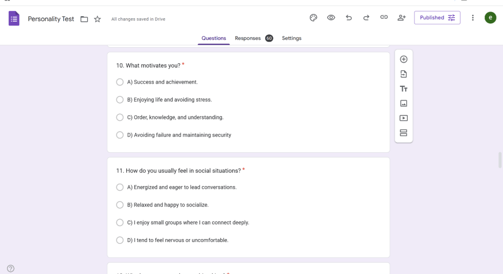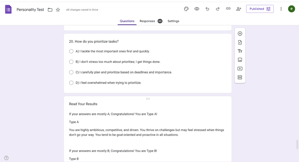 A modified version of the Myers-Briggs Type Indicator (MBTI) was administered via Google Forms to classify participants into five personality types: A, B, C, D, and X; See Appendix D. The MBTI, widely used in professional settings, assesses personality based on responses to situational questions. The Myers–Briggs Type Indicator (MBTI) utilizes a series of self-report questions designed to uncover consistent behavioral tendencies and cognitive preferences. Although the MBTI categorizes individuals into sixteen personality types rather than the binary Type A/Type B framework, the underlying process is similar: responses are analyzed to reveal stable traits that shape how a person approaches tasks, stress, and decision-making. In this way, MBTI results can highlight characteristics—such as competitiveness, urgency, or calmness—that align with qualities traditionally associated with Type A or Type B personalities. The survey derived similar questions to ensure they prompted participants to reveal certain traits that classify them as Type A or Type B. The modified survey was compared to the official MBTI test and tested on a few sample participants and yielded exact matches. The 16 personalities were able to fit into the A,B,C, D system: Type A ( ENTJ, ESTJ, ENTP, ESTP) and Type B ( ENFP, ESFP, ENFJ, ESFJ). The test consisted of 20 multiple-choice questions. Participants were classified based on majority responses, with ties resulting in a Type X designation. Only Type A and Type B participants were approved for the study, as previous research3 and a pilot test at the study site confirmed that the majority of the population falls within these two categories.