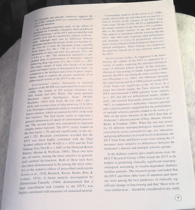 Evidently, focus has been a growing issue which will eventually lead to a regressing society if not combated soon. Ronald Lewis, PhD developed a test composed of cognitive, perceptual, and motor tasks designed to be sensitive to focus, the Digit Vigilance Test. Through his research he categorizes focus into three parts: alertness, selectivity, and processing capacity. In his development of the DVT, alertness was targeted as it involves vigilance during boring, repetitive tasks and the DVT is in fact a boring repetitive task. The DVT places minimal demands on the selectivity and capacity components of focus (PAR Inc. User’s Guide, 1996). Through testing of the DVT Lewis found that the DVT was insensitive to repeated administrations accruing from multiple trials. They also found high test reliability when comparing the one-page version to the two page version (p= .001).