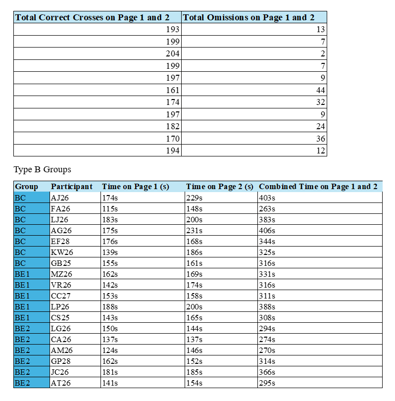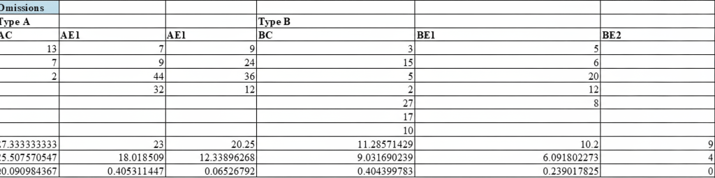 Results indicate that the Type A groups had a significantly higher number of omissions than the Type B groups. However, this trend is contrasted with the previous data point where Type A groups had a lesser average time. Referring to the literature review, the data referencing the Type A groups’ low completion time indicates good proficiency, but the number of omissions contradicts this observation as a higher number of average omissions indicates a lapse in focus. Descriptive statistics suggest a pattern that requires further testing, a trend of the Type B groups having better focus is displayed.
