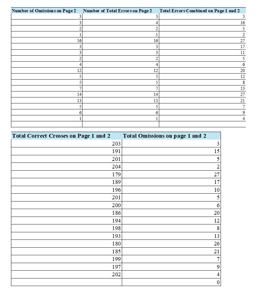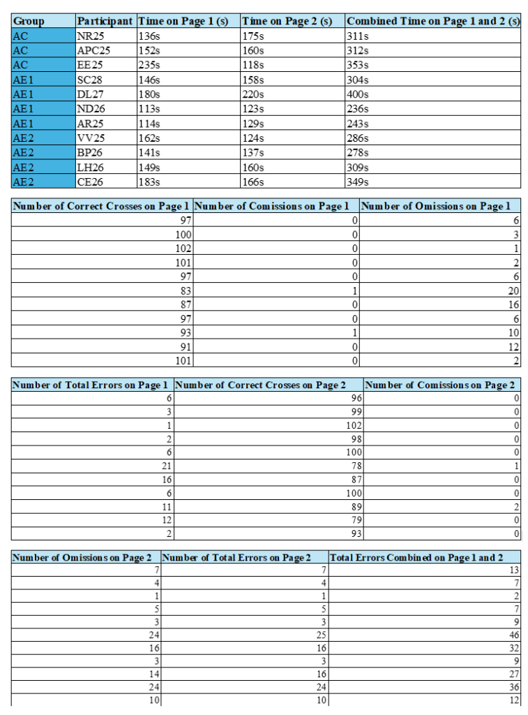 Participants received standardized instructions and a practice trial before beginning. They were instructed to complete the test as quickly and accurately as possible, marking only the number 9. They were told to raise their hand once finished with page 1 and do the same when finished with page 2. Completion time was recorded as a stopwatch was running for the whole of the experiment, and participants exceeding the seven-minute threshold per page were instructed to stop (as per PAR guidelines). Time was recorded using a stop watch and an additional volunteer to stop the stopwatch accurately. The timer was blinded to the group.