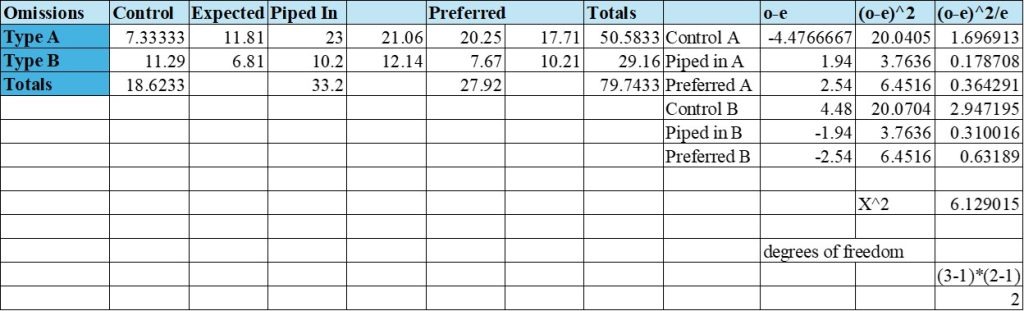 Hypothesis 2 posited that Type B individuals would exhibit greater focus with piped-in music than Type A individuals would experience as Type As are more sensitive to external stimuli. To investigate this, a second Chi-Square Test of Independence was performed, analyzing the average number of omissions between the piped-in groups: AE1 and BE1.