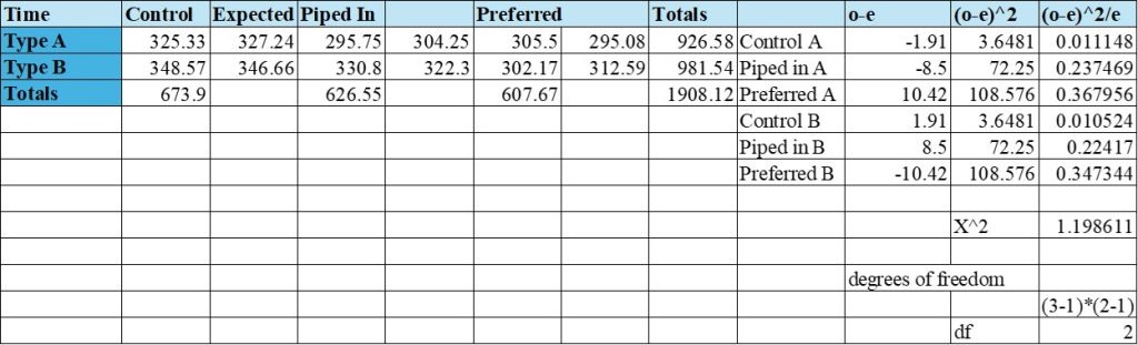 The groups were assigned categorical variables because the independent variables were Type A and B as well as no music, preferential music, or piped in. Since these variables are not quantitative but categorical, a Chi Square Test for Independence was run to account for the multiple variables and the outcome of time in one instance and errors in another. A T test was also performed but only arrived at a significant difference between control compared to preferred music with the preferred music being quicker for the Type B group.