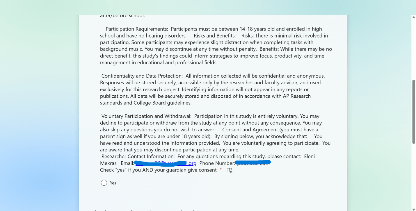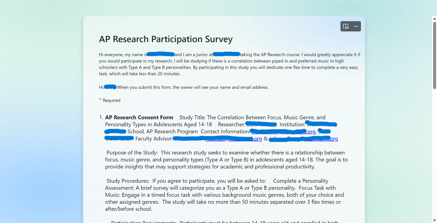 A Microsoft Forms survey, familiar to students due to the school’s requirement for Microsoft Surface Pro devices, was used to collect demographic information, including age and grade level. First and last name were required to keep participants organized and facilitate follow-up communication if they were approved to proceed to the next step, which was taking the personality survey. The survey also obtained informed consent from both participants and their parent/guardian. Potential participants were informed about the goal of this study, what they would be entailed to do, confidentiality of this study, as well as the right to withdraw at any time. Approved participants advanced to the personality assessment phase. See Appendix C for the Microsoft participation form which also includes the consent form. Per confidentiality guidelines all information regarding identifying details, including researcher names, school information, and personal contact information, has been redacted from the consent form.