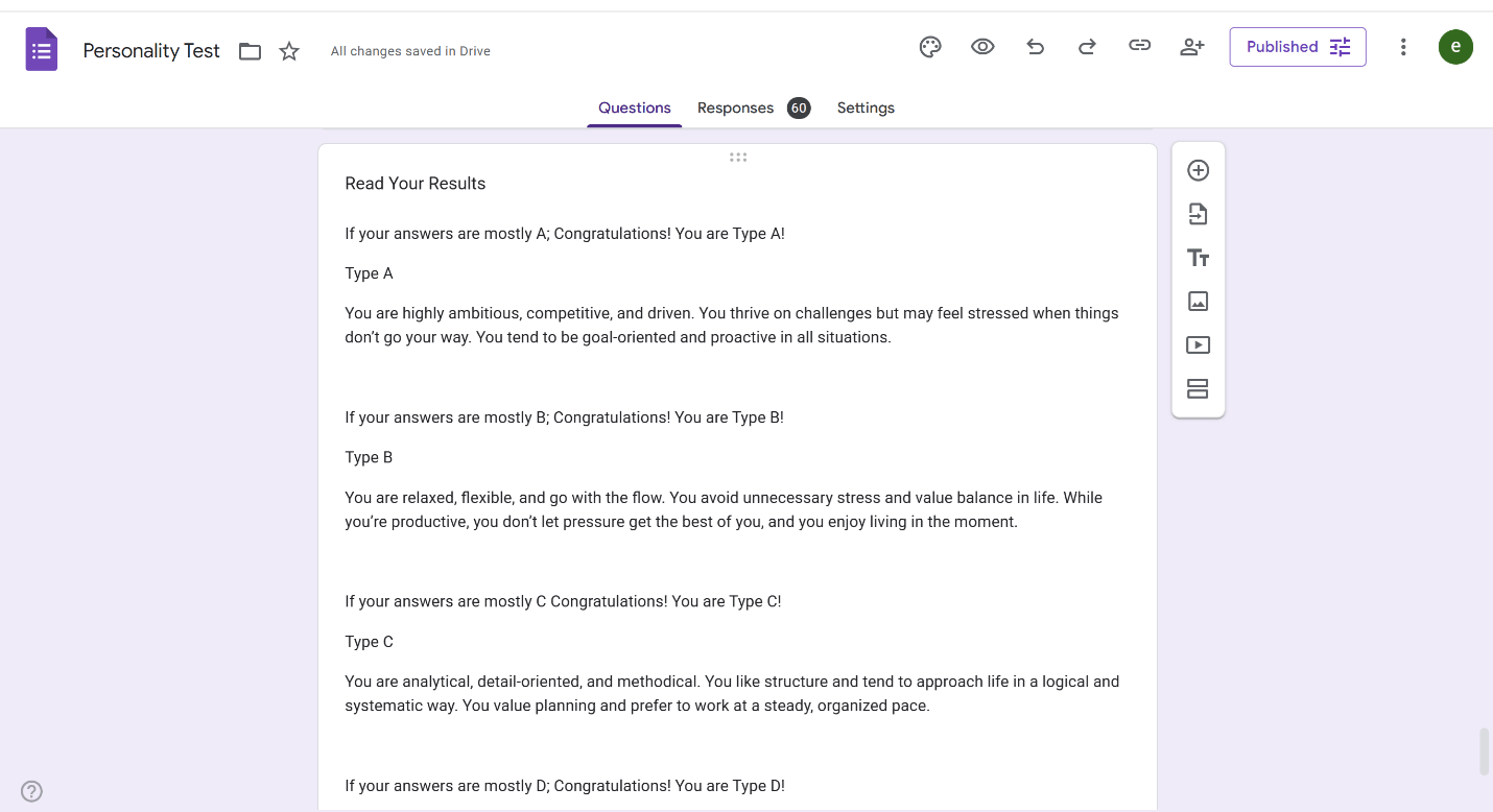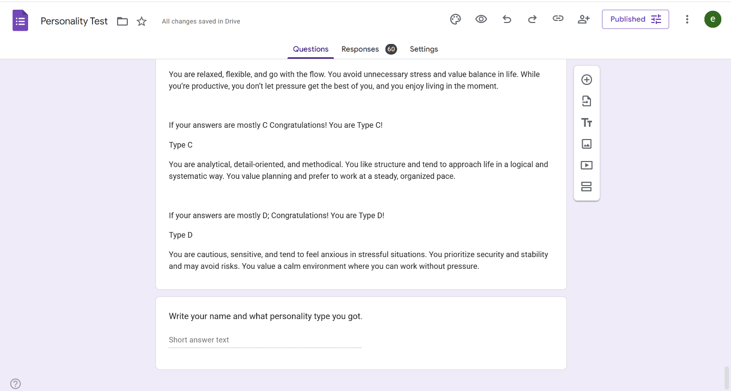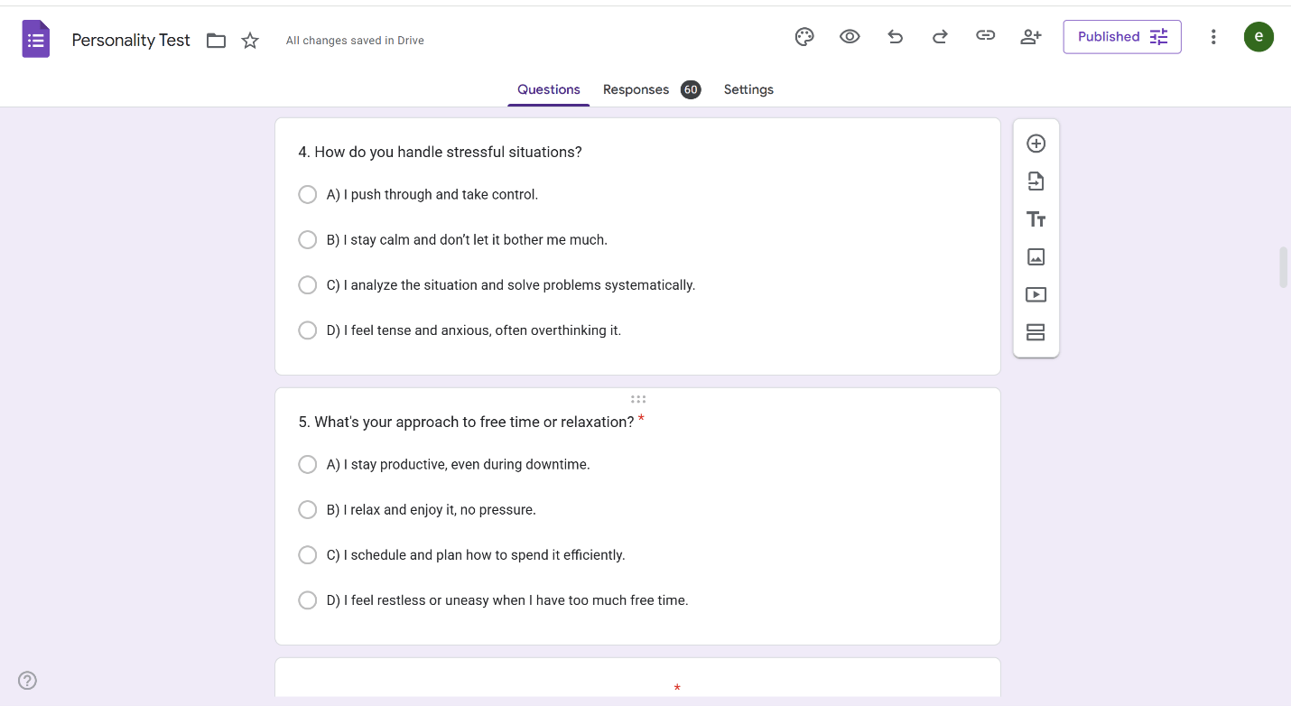 A modified version of the Myers-Briggs Type Indicator (MBTI) was administered via Google Forms to classify participants into five personality types: A, B, C, D, and X; See Appendix D. The MBTI, widely used in professional settings, assesses personality based on responses to situational questions. The Myers–Briggs Type Indicator (MBTI) utilizes a series of self-report questions designed to uncover consistent behavioral tendencies and cognitive preferences. Although the MBTI categorizes individuals into sixteen personality types rather than the binary Type A/Type B framework, the underlying process is similar: responses are analyzed to reveal stable traits that shape how a person approaches tasks, stress, and decision-making. In this way, MBTI results can highlight characteristics—such as competitiveness, urgency, or calmness—that align with qualities traditionally associated with Type A or Type B personalities. The survey derived similar questions to ensure they prompted participants to reveal certain traits that classify them as Type A or Type B. The modified survey was compared to the official MBTI test and tested on a few sample participants and yielded exact matches. The 16 personalities were able to fit into the A,B,C, D system: Type A ( ENTJ, ESTJ, ENTP, ESTP) and Type B ( ENFP, ESFP, ENFJ, ESFJ). The test consisted of 20 multiple-choice questions. Participants were classified based on majority responses, with ties resulting in a Type X designation. Only Type A and Type B participants were approved for the study, as previous research3 and a pilot test at the study site confirmed that the majority of the population falls within these two categories.