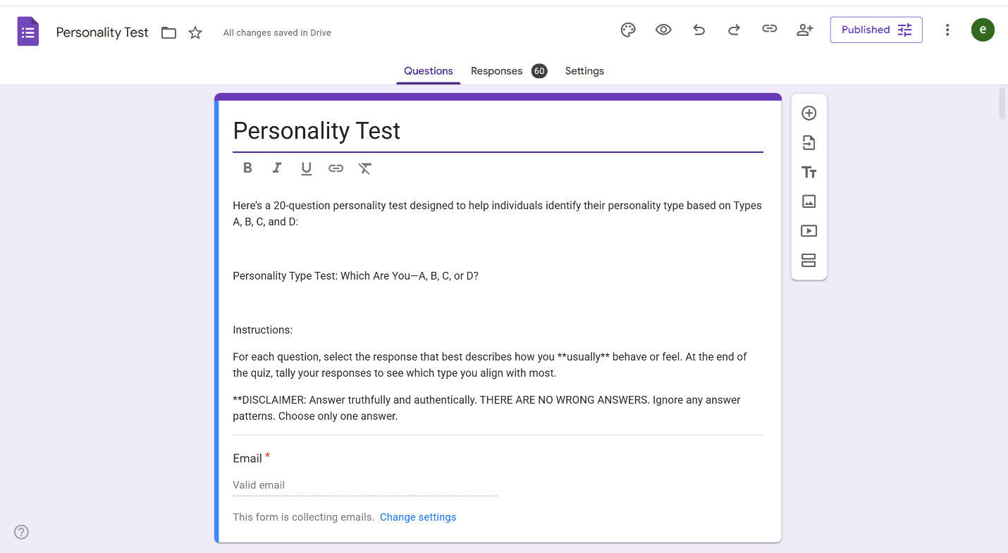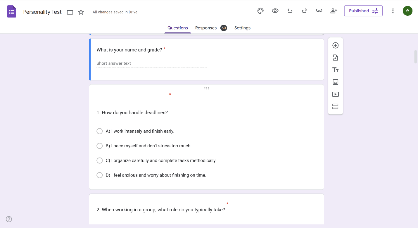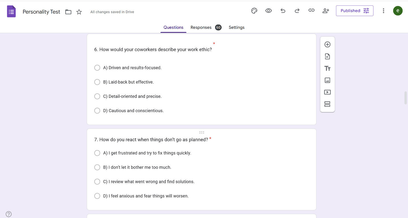 A modified version of the Myers-Briggs Type Indicator (MBTI) was administered via Google Forms to classify participants into five personality types: A, B, C, D, and X; See Appendix D. The MBTI, widely used in professional settings, assesses personality based on responses to situational questions. The Myers–Briggs Type Indicator (MBTI) utilizes a series of self-report questions designed to uncover consistent behavioral tendencies and cognitive preferences. Although the MBTI categorizes individuals into sixteen personality types rather than the binary Type A/Type B framework, the underlying process is similar: responses are analyzed to reveal stable traits that shape how a person approaches tasks, stress, and decision-making. In this way, MBTI results can highlight characteristics—such as competitiveness, urgency, or calmness—that align with qualities traditionally associated with Type A or Type B personalities. The survey derived similar questions to ensure they prompted participants to reveal certain traits that classify them as Type A or Type B. The modified survey was compared to the official MBTI test and tested on a few sample participants and yielded exact matches. The 16 personalities were able to fit into the A,B,C, D system: Type A ( ENTJ, ESTJ, ENTP, ESTP) and Type B ( ENFP, ESFP, ENFJ, ESFJ). The test consisted of 20 multiple-choice questions. Participants were classified based on majority responses, with ties resulting in a Type X designation. Only Type A and Type B participants were approved for the study, as previous research3 and a pilot test at the study site confirmed that the majority of the population falls within these two categories.