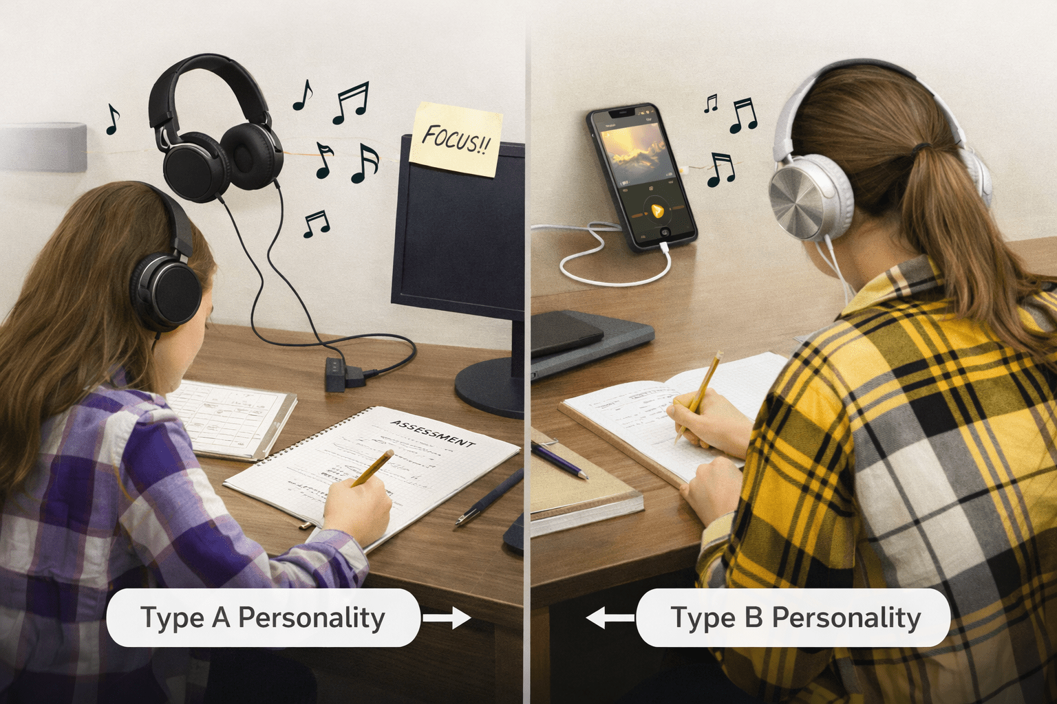 In the wake of the COVID-19 pandemic, adolescents have reported increased difficulties with focus. These challenges coincide with heightened screen time and irregular sleep patterns. Prior research has explored the relationships between music, personality, and focus separately. However, no study has examined how personality type may moderate the impact of background music on attention. This is an issue worth examining because understanding the relationship between personality, music, and focus could help students or working adults improve task efficiency with a simple fix. This study investigates whether a correlation exists between music type (preferred or piped-in) and focus in high school students with Type A and Type B personalities. A quasi-experimental design was used to measure focus using the Digit Vigilance Test (DVT). Twenty-nine students aged 14–18 from a private high school were classified as either Type A or Type B through a modified MBTI survey. A modified version was used as a result of a lack of funds for the study. The survey derived similar questions to ensure they prompted participants to reveal certain traits that classify them as Type A or Type B. The modified survey was compared to the official MBTI test and tested on a few sample participants and yielded exact matches. The 16 personalities were able to fit into the A,B,C, D system: Type A ( ENTJ, ESTJ, ENTP, ESTP) and Type B ( ENFP, ESFP, ENFJ, ESFJ). Participants were divided into six groups based on personality type and music condition (no music, piped-in, or preferred). Focus was evaluated based on completion time and omission errors, and results were analyzed using t-tests and Chi-Square Tests of Independence. There was no statistically significant relationship between average DVT completion time and music type across personality groups. However, a significant positive correlation was found between omission errors and personality type when piped-in music was introduced, with Type B individuals showing improved focus and reduced errors. Type A participants exhibited greater variability and sensitivity to music stimuli. This study suggests that background music impacts focus differently based on personality. Type B individuals benefit from piped-in music, while Type A individuals may be more distractible. These findings support personalized auditory strategies for improving focus in educational settings.