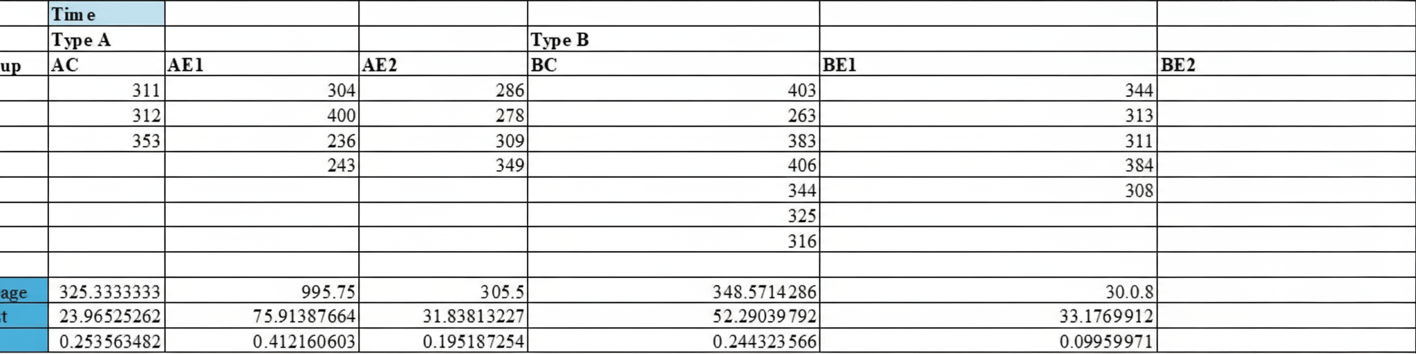 Among the B groups, group BC had an average completion time of 338.57 seconds (SD = 52.29), group BE1 took 330.80 seconds (SD = 33.18), and group BE2 took 302.17 seconds (SD = 35.10).