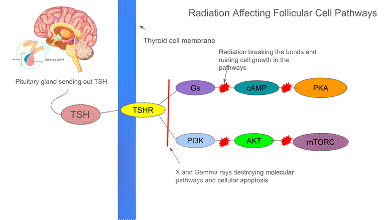 Figure 2 | A molecular level that explains the importance of the 2 main pathways in the follicular cell, and how radiation affects the thyroid hormones and overall functions of the cells and pathways.