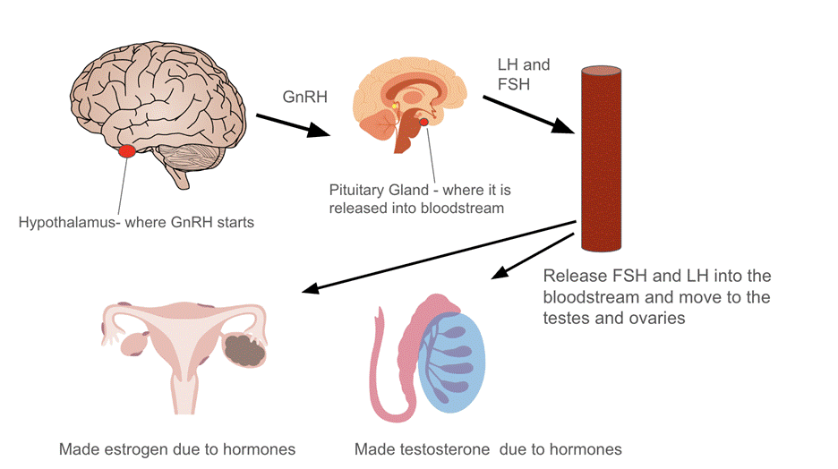 Figure 1 | The spread of GnRH starts in the hypothalamus, then the hormone moves to the pituitary gland, where it is released into the bloodstream, and turned into LH and FSH. Once released, these hormones move to the ovaries and testes where they are used to make testosterone and estrogen.