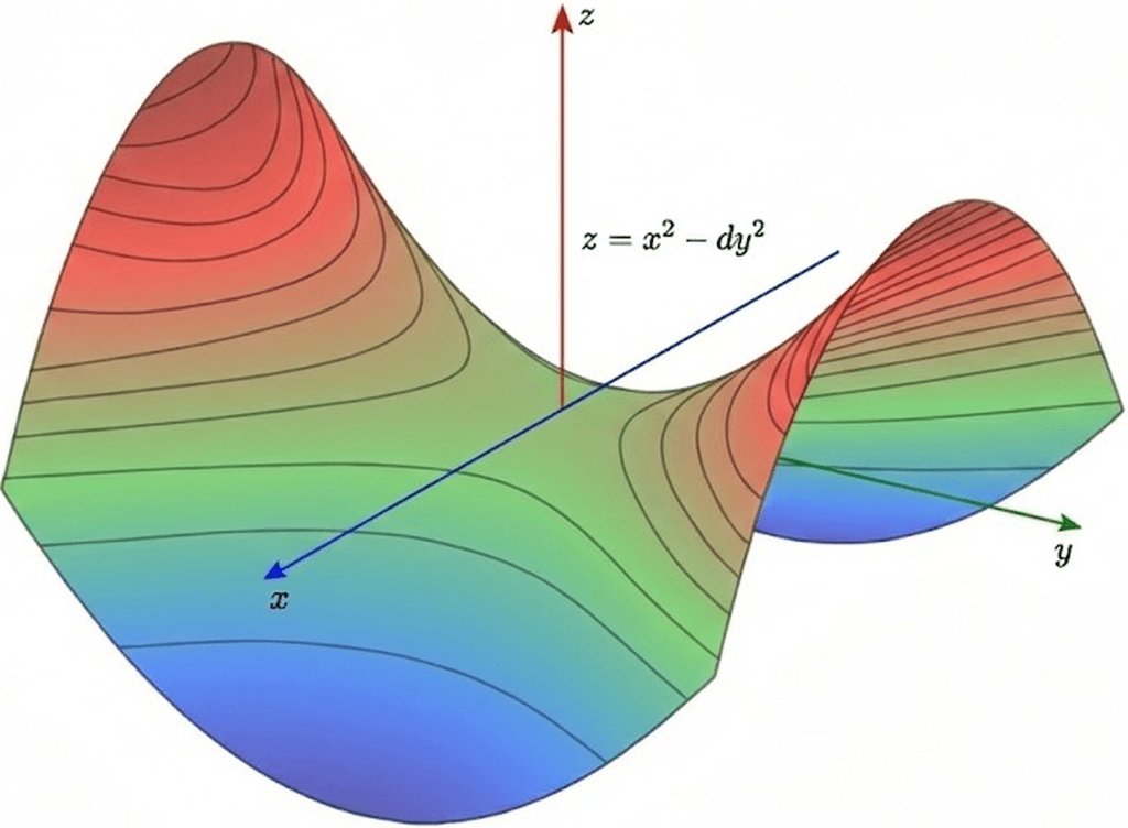 Fig 1 | indefinite-quad.png – The surface z = x^2 - d y^2 for d > 0, an example of an indefinite quadratic form. Its zero set is a double cone, illustrating the geometric origin of isotropic vectors.