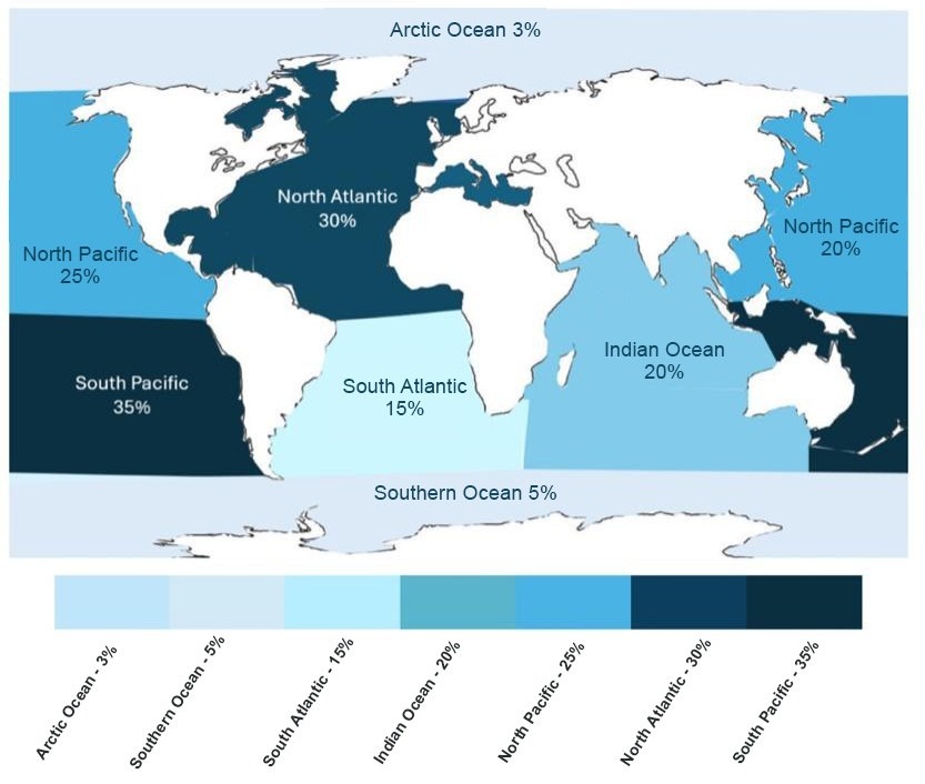 The heat map in figure 1 was created using datasets from FAO global fisheries assessments which estimated seabed disturbance in proportion to total ocean area6,23. Darker shades represent higher trawling intensity following the approach of T. Mazor and coworkers25.