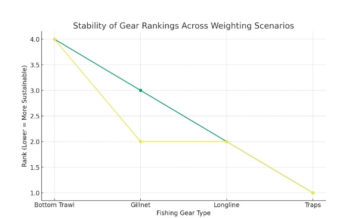Across all situations, bottom trawling ranked as lowest while traps and long lines ranked highest. Fishnets showed moderate variability but did not outperform traps or longlines, indicating that gear performance rankings are resistant to rational weighting changes, confirming the scoring framework’s stability.