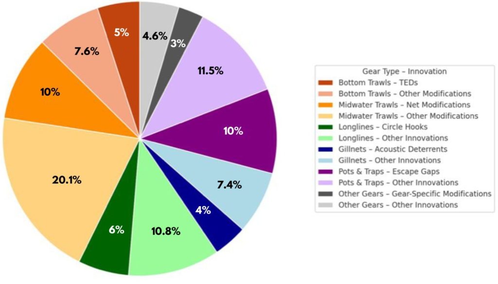 Figure 6 illustrates adoption rates of gear improvements. Pots and traps lead in certification uptake and gear innovation, followed by longlines and midwater trawls. Bottom trawls are the least represented in innovation and certification reflecting structural and institutional issues in scaling modifications.