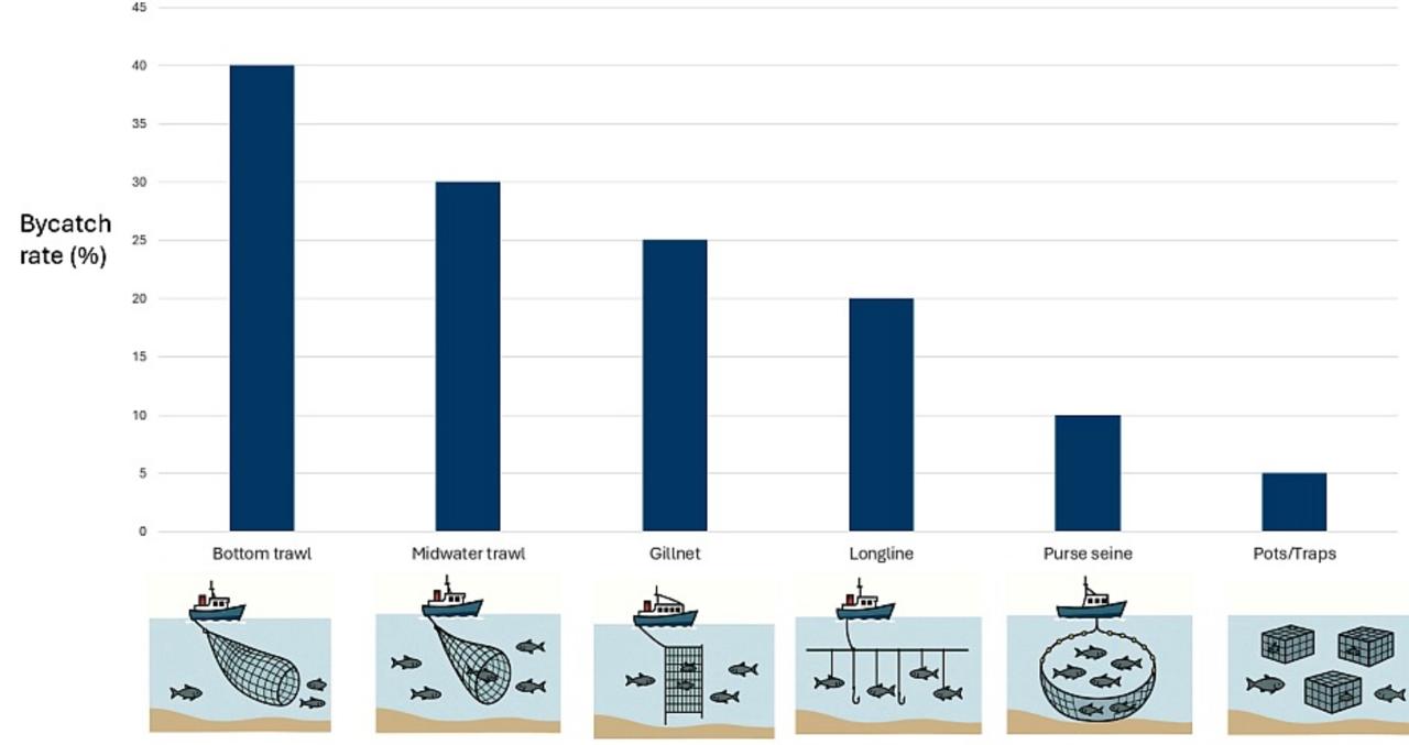 In figure 2 bycatch rates were compiled from FAO assessments and peer-reviewed studies on gear selectivity and discard patterns and standardized as the percentage of total catch composed of non-target species6,3. Data was organized by gear type and visualized in vertical bar charts.