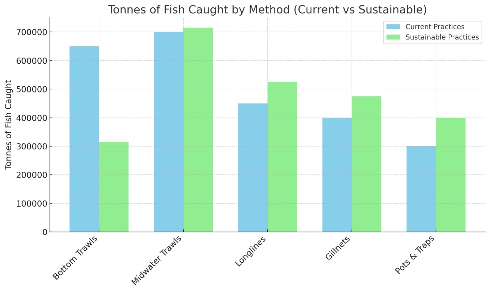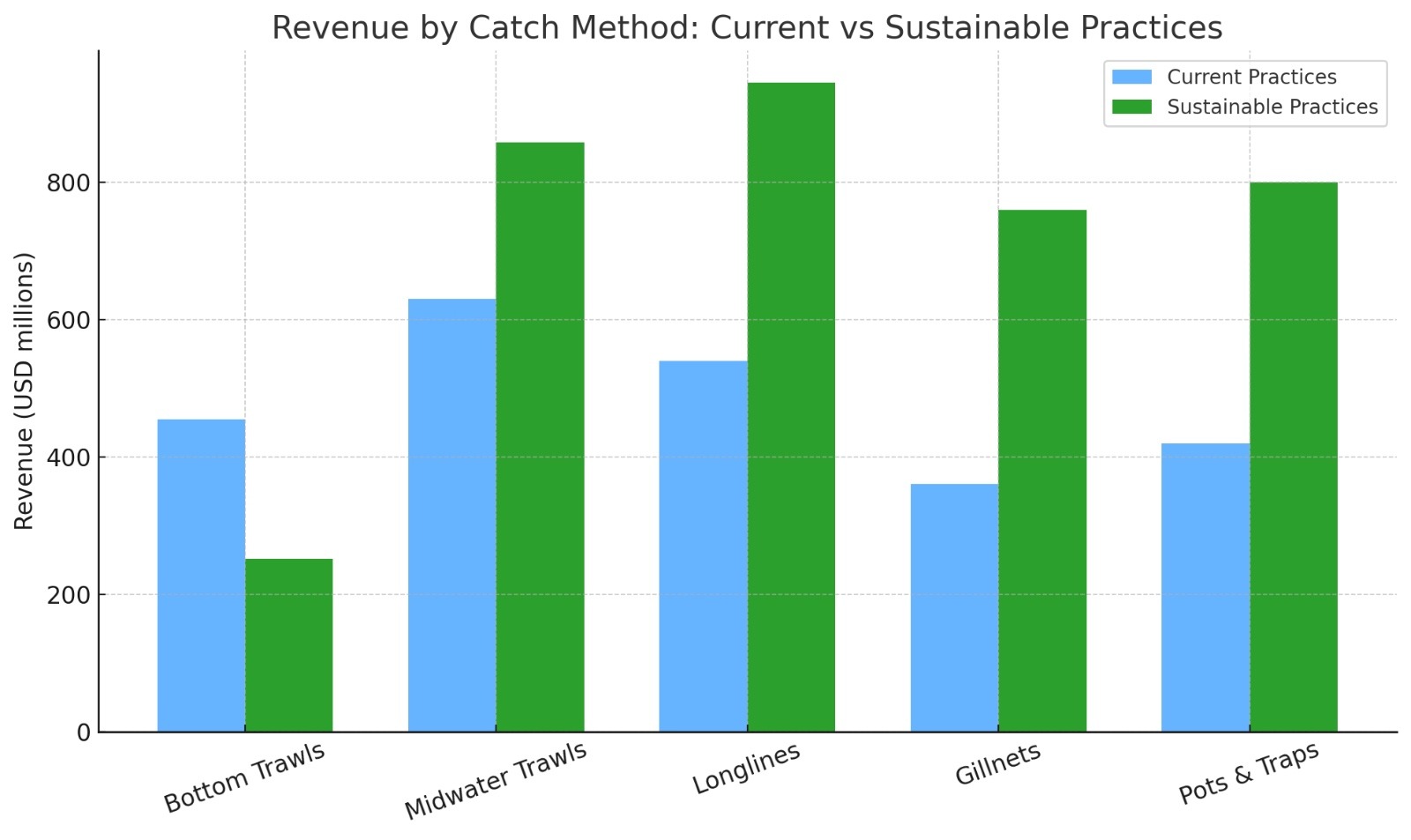 Figure 4 represents revenue by catch method and Figure 5 represents tonnes of fish caught by method ( Current vs Sustainable Practices) and were constructed using FAO FishStatJ6. Price assumptions were based on published findings24.