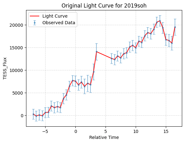 We analyze a curated dataset of processed TESS light curves provided by an MIT laboratory preprocessing pipeline. Because the files were delivered as preprocessed time-series products, mission acquisition metadata (e.g., sector identifiers and cadence) were not consistently available and are therefore not used as selection variables in this study. We treat the provided columns (relative_time, tess_flux, tess_uncert) as the primary observables and describe all additional transformations that we apply in Section Preprocessing: Per-object Robust Clipping, Normalization, and Uncertainty Weights.The dataset consists of 3,659 unlabeled CSV light-curve files, each corresponding to a single object. Each file contains time-series data with three columns: relative_time, tess_flux, and tess_uncert. Figure 1 is a randomly selected light curve file, representing the original light curve of object 2019soh, including the relative time, flux, and flux uncertainty values. To construct a unified dataset for this analysis, we combined all individual light curve files into a single dataset. To associate each data point with its corresponding object, we extracted an identifier from the file name and added it as a new column, object_name. For example, for a file named lc_2019soh_processed, the object_name was derived as 2019soh, where “lc” and “processed” are common prefixes and suffixes shared across all file names. The final dataset comprises four columns: relative_time, tess_flux, tess_uncert, and object_name.