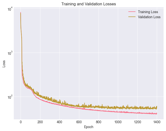 We use a recurrent encoder–decoder architecture with a hidden size of 128, latent size of 16, and 4 recurrent layers. We train with Adam (learning rate 10-4) for up to 1400 epochs, saving checkpoints periodically. Convergence is monitored using validation reconstruction error and ELBO components (reconstruction and KLD).18