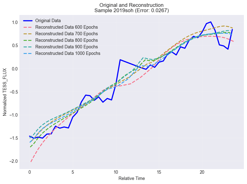 Figure 10b shows the normalized light curve for object 2019soh mentioned earlier, before and after training. The reconstruction curves caught the pattern of the original curve, and the model performed well for the studied epochs.