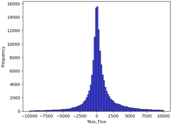 When performing the raw data distribution for all data points, the minimum tess_flux is -3.1e8, the maximum tess_flux is 1.2e7, approximately 0.1% of the tess_flux exceeded 1.1e6 or fell below -1.1e6, and approximately 7.3% of the tess_flux exceeded 1e4 or fell below -1e4. The distribution of tess_flux is illustrated in Figure 3, which shows that most of the data lies within the range of -5,000 to 5,000. The extreme data is from peak of transient light curves typically, a transient light curve example shown in Figure 5 after normalization.