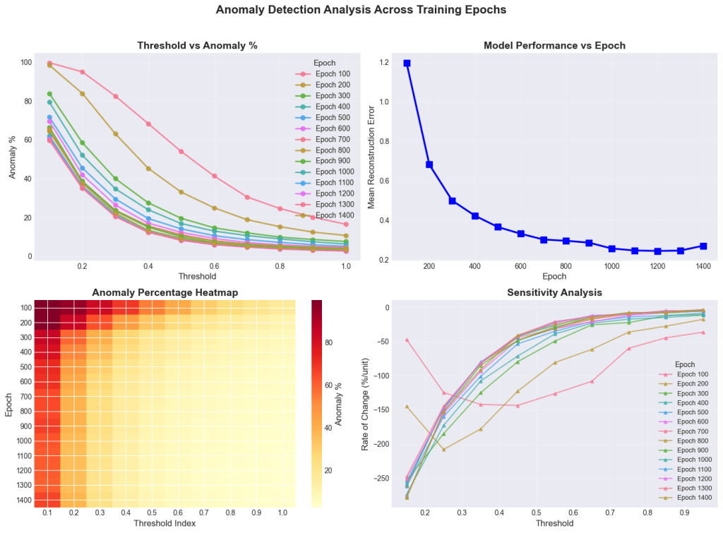 To select a defensible checkpoint and threshold, we perform a two-dimensional sweep: epochs from 200 to 1400 (step 100) and reconstruction-error thresholds from 0.2 to 0.9 (step 0.1). For each epoch, t, we compute the anomaly fraction: