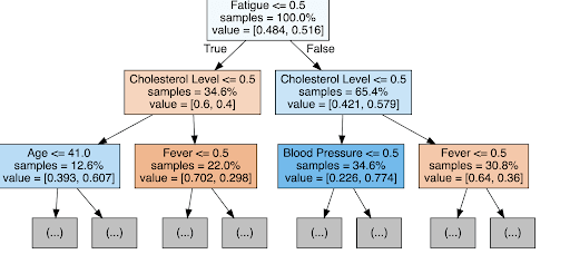 Confusion matrix analysis highlighted the relatively low number of false positives and false negatives, and ablation studies validated that features such as Age, Difficulty Breathing, Fever, and Cholesterol Level were critical for maintaining predictive performance1,2,15. Examination of individual decision trees from the random forest, along with feature importance analysis, allowed for a clear understanding of how the model arrived at specific predictions. These insights are especially valuable in clinical contexts, where transparency in diagnostic reasoning is essential for trust and adoption by healthcare providers8,10,12. Although the current study used ablation and tree walkthroughs for interpretability, future work may include full SHAP-based explanations to provide even deeper insights into feature contributions.