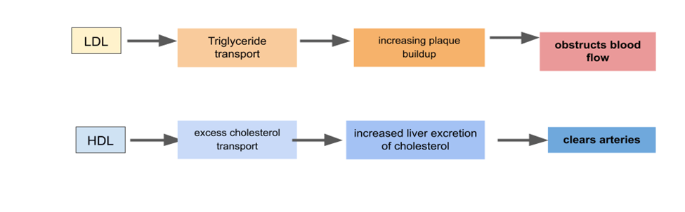 There are three types of cholesterol, one “good” cholesterol, and two “bad” cholesterols. First, High-density Lipoproteins (HDL). HDL’s job as being the “good” cholesterol is to transport any excess cholesterol to the liver for excretion, helping with clearing the arteries. Conversely, very low-density lipoproteins (VLDL) transport triglycerides through-out the human body. However, VLDL is considered bad because it is a factor behind the buildup of plaque and the obstruction of blood flow. When increasing the amount of low-density lipoproteins (LDL), there is an increased risk for plaque forming in someone’s arteries as shown by Table 1 and this also contributes to the formation of plaque in the arteries. The figure below is an illustration of lipid transport and how it relates to plaque building on the artery walls as well as an illustration of the different pathophysiologic effects of VLDL, HDL and LDL, as shown in Figure 1.